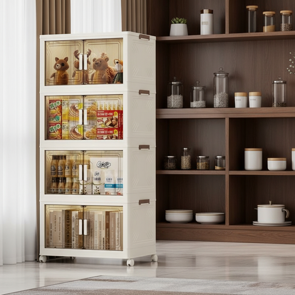 Sus puertas transparentes de doble apertura cuentan con cierre magnético. Es ideal para mover ya que cuenta con ruedas giratorias de 360 grados con botón de bloqueo. Es Ideal para mantener el hogar limpio, ordenado y para maximizar espacio de guardado.