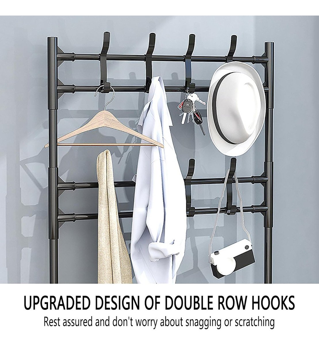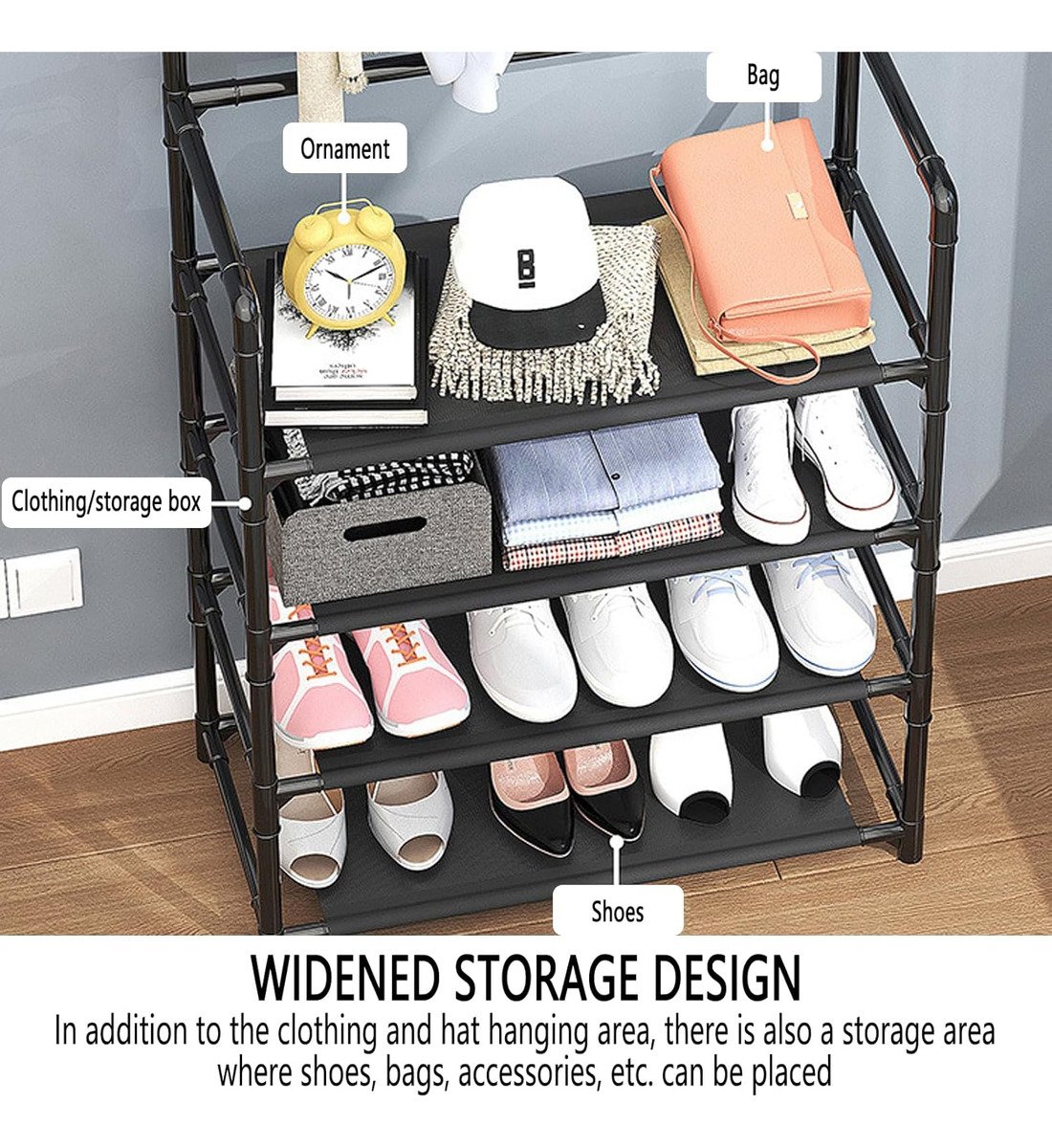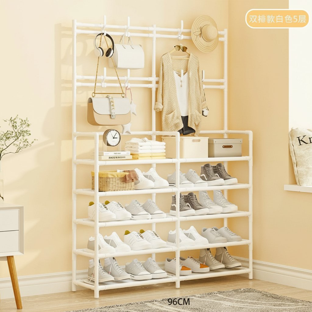 Mantené tu hogar organizado con este perchero y zapatero de metal con 5 niveles, ideal para mantener tu ropa y calzado en perfecto orden. Gracias a su diseño vertical, permite aprovechar mejor el espacio en dormitorios, vestidores o pasillos.