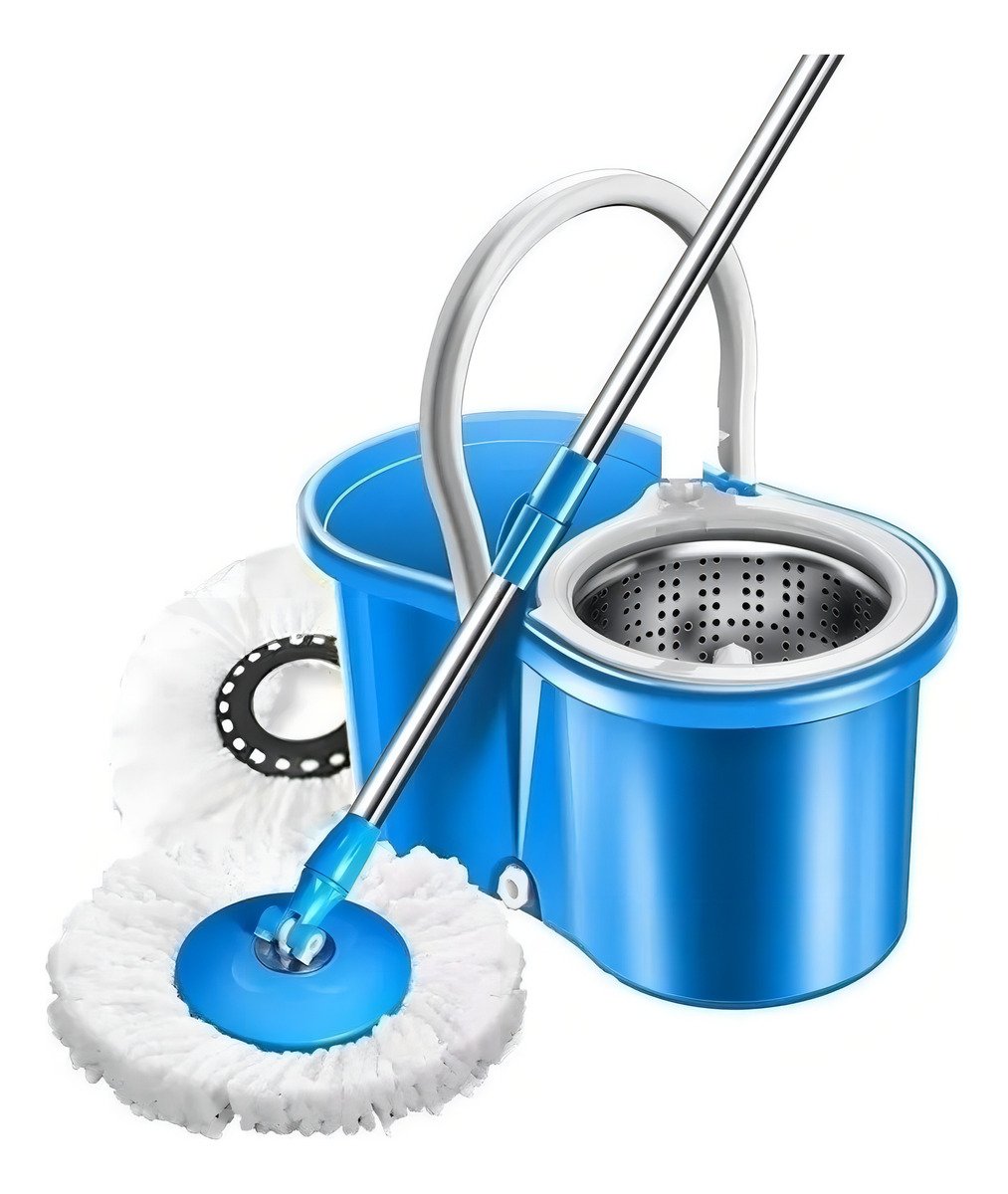 Práctica mopa super absorbente y para todo tipo de superficies, con balde en plástico resistente y escurridor en acero inoxidable. Además, cuenta con rueditas para fácil traslado. Incluye dos mopas.